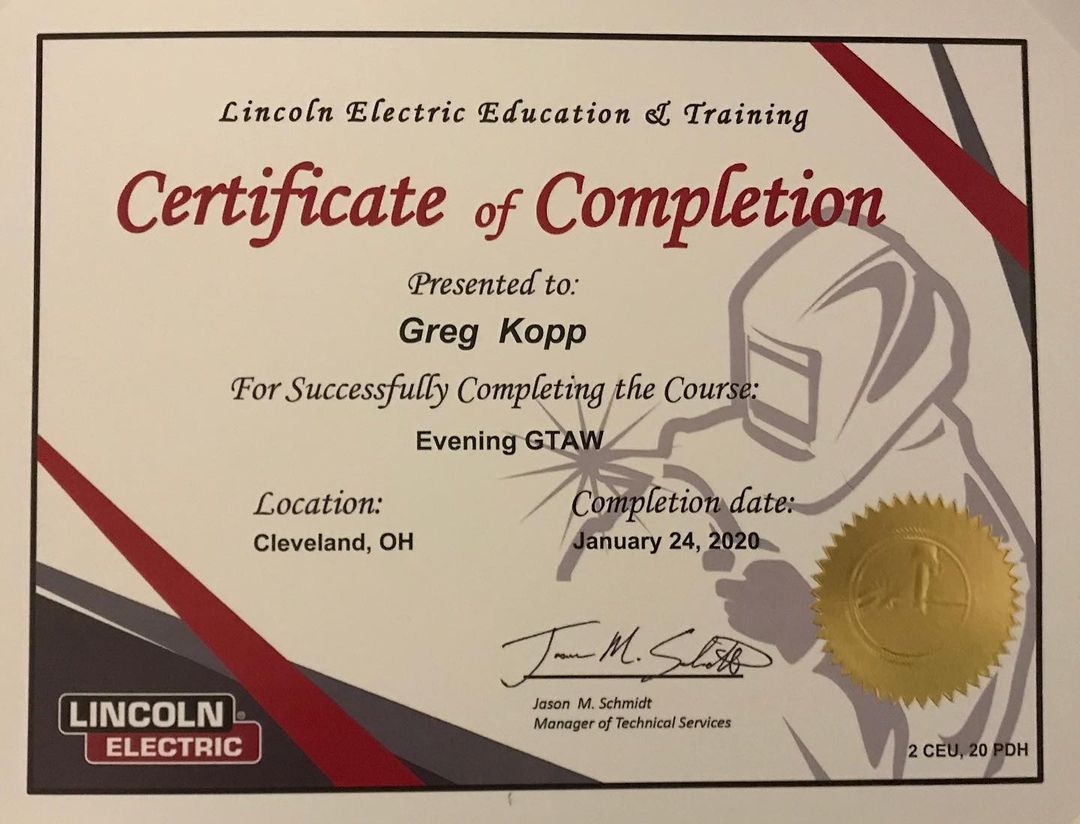 Completed a week long class in TIG (GTAW) at Lincoln Electric Welding School. Hats off to our instructors, Lance and Karl. They’re tops! I appreciated the attention you can only get one on one. Unexpectedly, we also learned a lot about metallurgy. Nice bonus! Lots of time under the hood. Still need lots of practice. Hoping to score some scrap metal from some local scrap yards and still need to get a lot more filler rod. Might have to find some more classes to take!